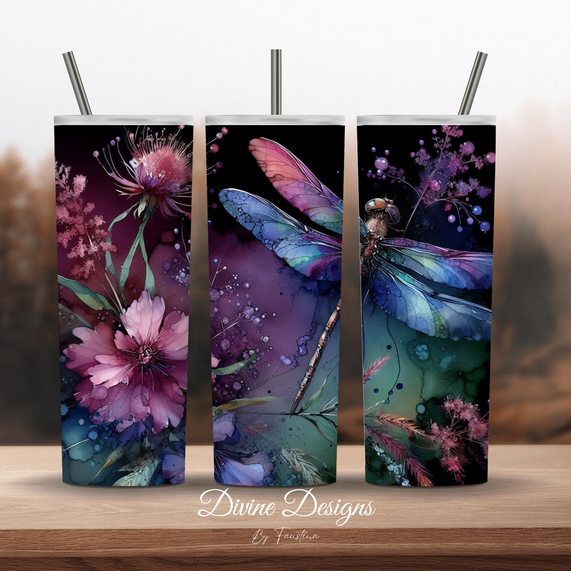 Capture the delicate beauty of nature with our enchanting Dragonfly & Floral 20oz skinny tumbler! This exquisite tumbler features a stunning watercolor design of a vibrant dragonfly with iridescent wings, gracefully surrounded by lush purple and pink flowers, intricate foliage, and subtle sparkling accents. The dark background makes the colors pop, creating a truly serene and mystical garden scene.