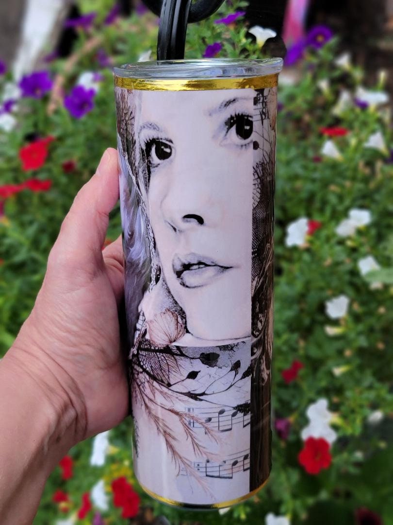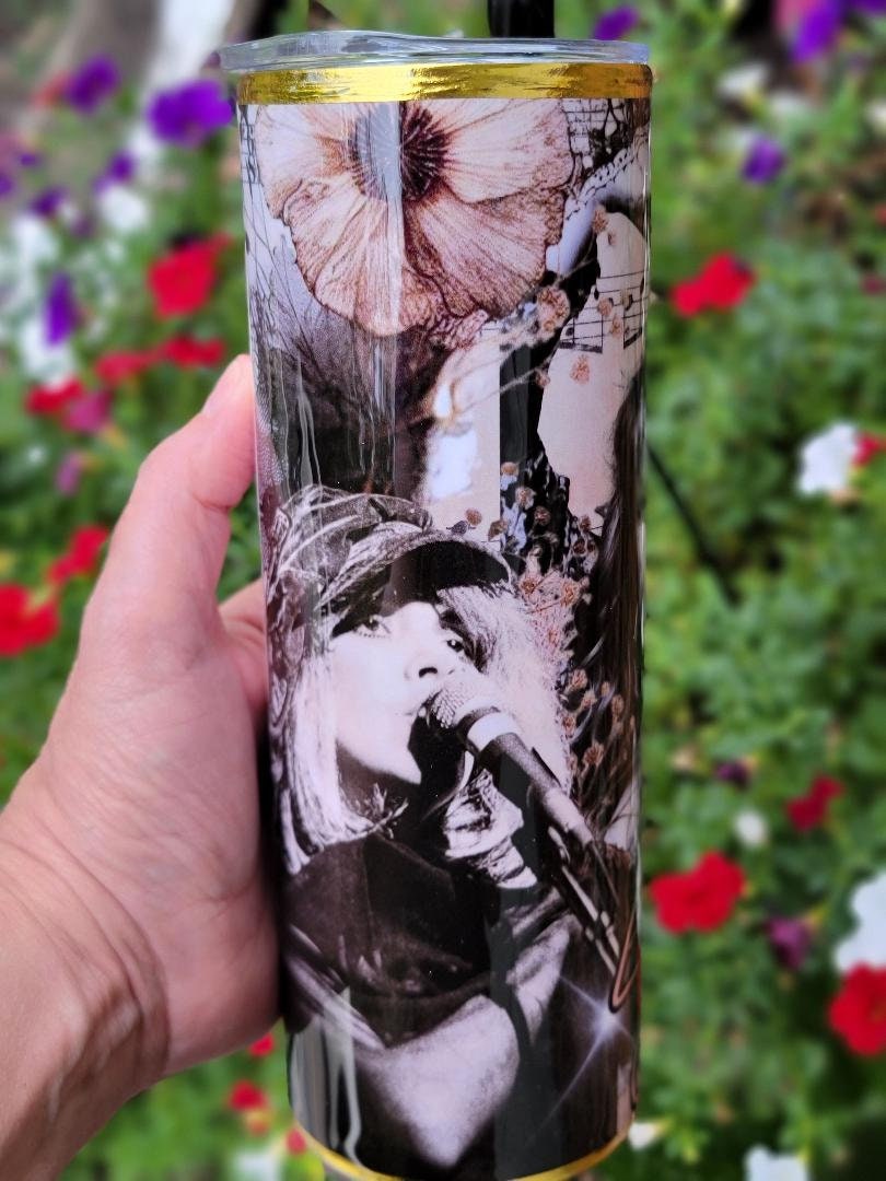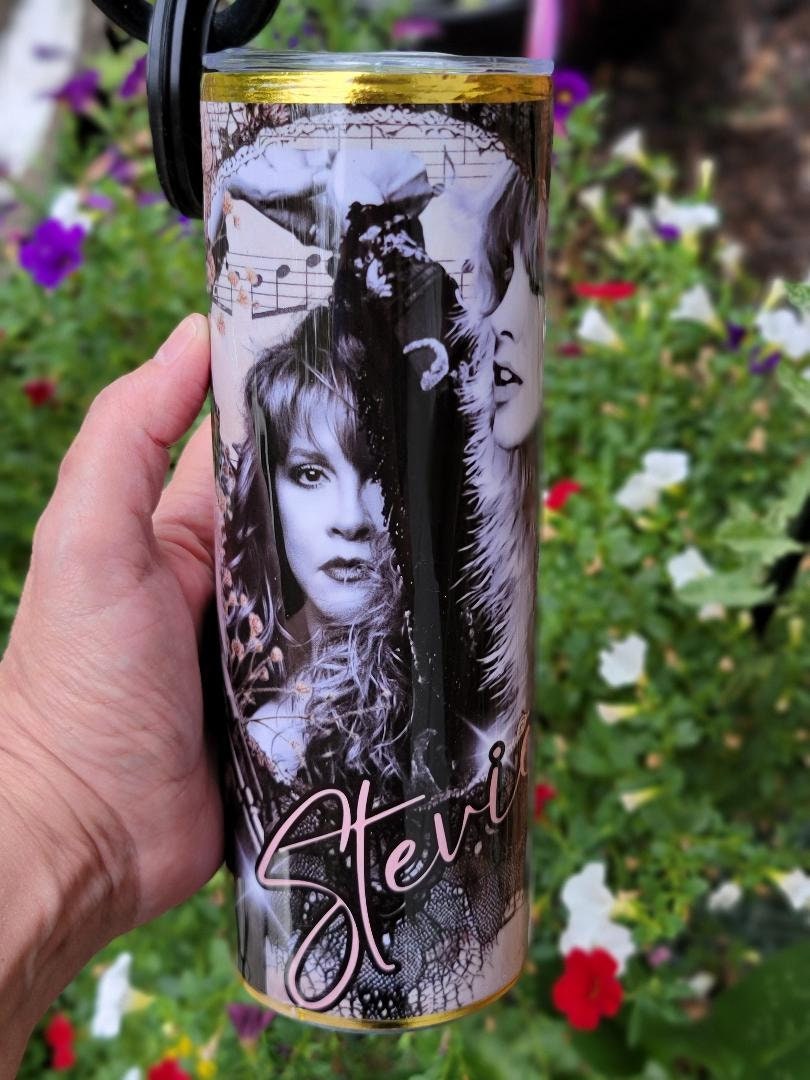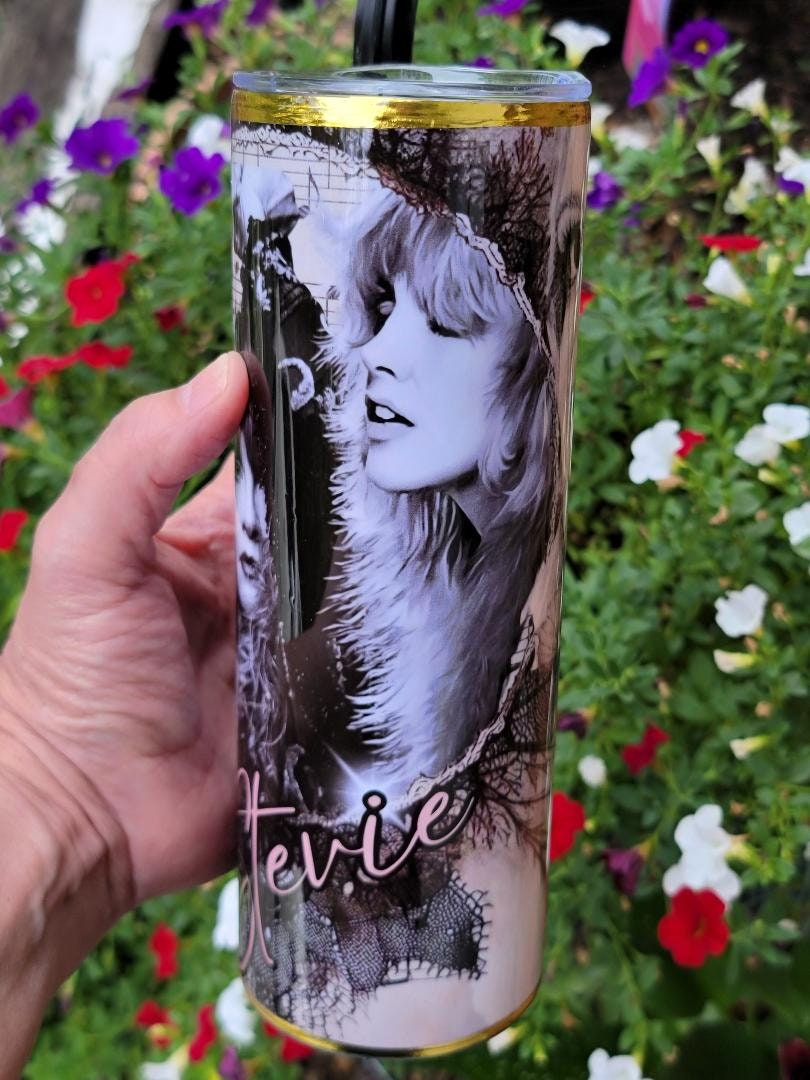 Music artist Stevie 20 oz insulated Skinny Tumbler Stainless Steel Sliding lid ,Plastic reusable straw ,Perfect for Gift giving , This IS a Physical tumbler !