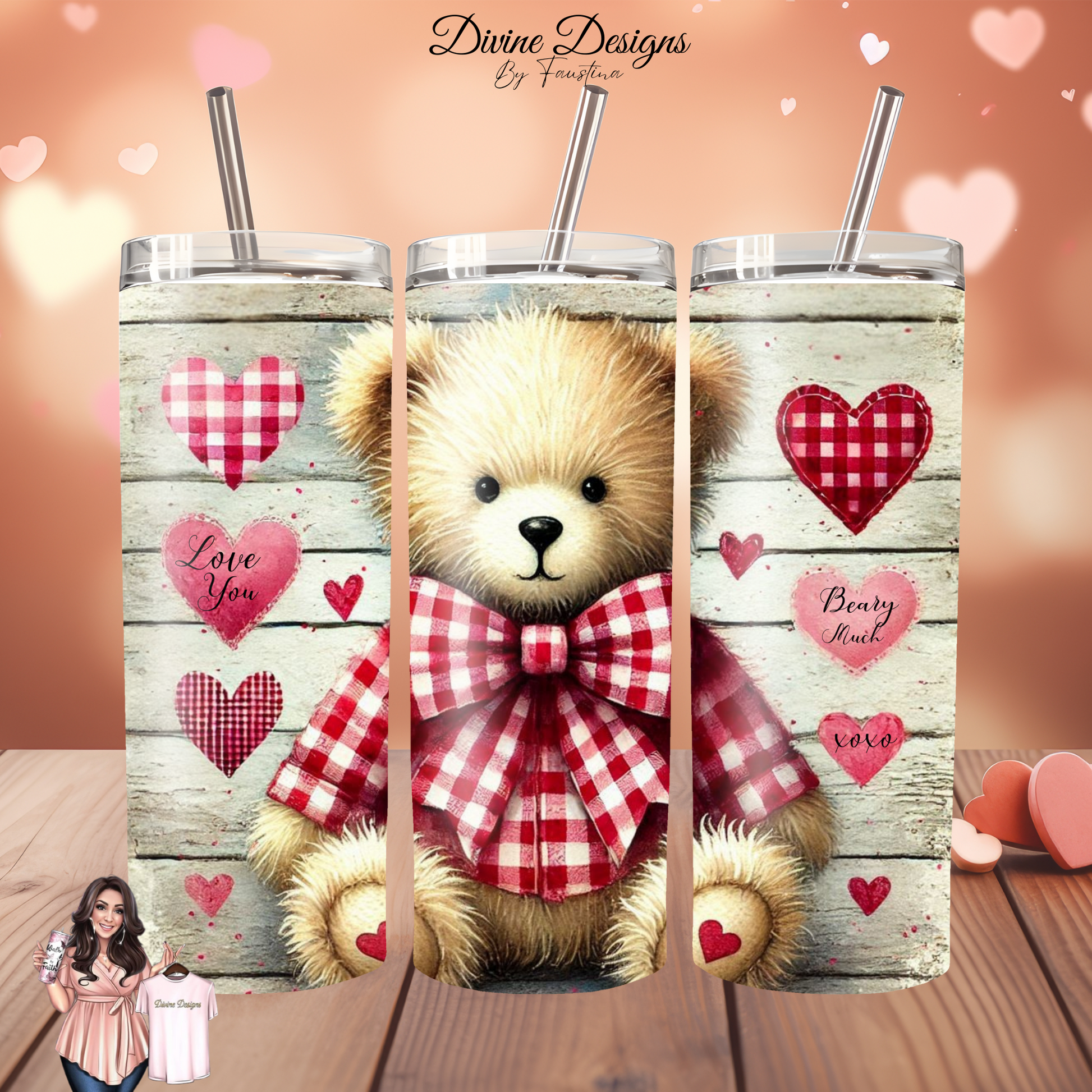 Valentines Day Teddy Bear Tumbler 20oz with lid and straw